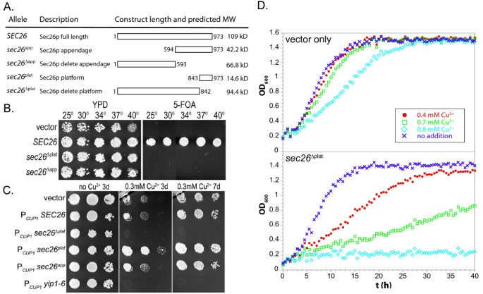 实验目的是通过遗传缺失实验,明确Sec26p附加结构域对酵母细胞存活与COPI功能的必要性。方法细节为构建两种截短突变体:sec26Δapp(仅保留Sec26p的主干区域,缺失整个附加结构域)和sec26Δplat(缺失平台亚域),将突变体载体转化至sec26Δ酵母菌株,通过5-氟乳清酸(5-FOA)质粒替换实验筛选仅表达突变体的菌株,观察不同温度下的生长情况;同时构建铜诱导型过表达载体,将突变体与野生型Sec26p分别在野生型酵母中过表达,通过固体平板生长与液体生长曲线分析其显性负效应。结果解读:质粒替换实验显示,sec26Δapp与sec26Δplat突变体菌株在25℃至40℃的5-FOA平板上均无法存活(n=3,P<0.01),证明附加结构域尤其是平台亚域是酵母存活的必需元件;过表达实验显示,sec26Δplat突变体在0.3mM CuSO4诱导下可完全抑制野生型酵母的生长,且生长抑制效果随CuSO4浓度升高而增强(n=3,P<0.01),表明该突变体可通过竞争性结合干扰野生型COPI复合物的功能,具有显性负效应,进一步证实附加结构域的功能重要性。