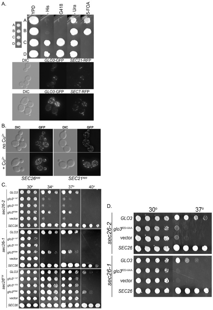 实验目的是筛选Sec26p附加结构域的下游调控因子,明确其与Glo3p的相互作用机制及功能意义。方法细节为通过抑制子筛选,将sec26ts突变体菌株与酵母基因组文库共转化,筛选在 restrictive温度下可恢复生长的克隆,通过测序鉴定调控基因;构建Glo3p的截短突变体(仅保留GAP结构域或前2/3序列)与催化活性突变体(glo3R59K,精氨酸突变为赖氨酸,丧失GTP酶激活活性),验证其对sec26ts突变体的抑制作用;通过荧光蛋白标签技术,将Glo3p与Sec26p附加结构域共表达,观察Glo3p的亚细胞定位变化。结果解读:抑制子筛选结果显示,Glo3p过表达可部分恢复sec26ts突变体的生长,且该恢复作用不依赖Glo3p的催化活性(glo3R59K突变体同样具有抑制效果),但依赖其羧基端的ISS基序(突变ISS基序后抑制作用完全丧失);荧光共定位实验显示,过表达Sec26p附加结构域不影响Glo3p的高尔基体定位,表明二者的相互作用不依赖亚细胞定位的改变。