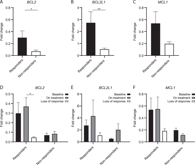 实验目的:建立鲁索替尼治疗的骨髓纤维化患者队列,检测BCL2、BCL2L1及MCL1的基线与治疗中基因表达水平。方法细节:纳入19例骨髓纤维化患者(11例原发性、8例继发性),采集患者粒细胞样本并提取cDNA,采用实时荧光定量PCR(qPCR)技术,以健康供体为对照,通过2-ΔΔCt法计算基因表达的倍数变化(FC)。结果解读:基线时,骨髓纤维化患者的BCL2(平均FC 0.15)与MCL1(平均FC 0.32)表达水平较健康供体显著降低,BCL2L1表达呈现非显著上调趋势(平均FC 1.33);除EZH2突变患者的BCL2L1表达显著更高外,基线基因表达与其他临床及分子特征无显著关联。产品关联:文献未提及具体实验产品,领域常规使用实时荧光定量PCR试剂盒、RNA提取试剂、逆转录试剂盒等。