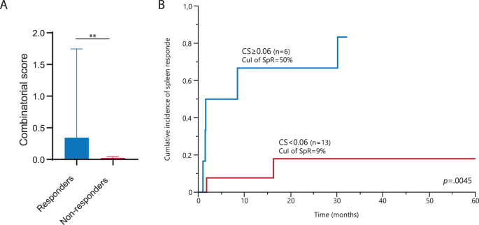 研究过程详述:Biomarker的来源为19例骨髓纤维化患者的粒细胞cDNA样本,验证方法为实时荧光定量PCR(qPCR),以健康供体的基因表达为参照计算FC值;在特异性与敏感性方面,联合评分CS的ROC曲线最佳cut-off值为0.06,可有效区分应答者与非应答者,对应24周脾脏应答累积发生率的差异具有统计学意义(50% vs 9%,n=19,P=0.0045);单个标志物中,BCL2与BCL2L1的基线表达均能独立预测应答,对应的OR值分别为5.2(P=0.0337)与1.4(P=0.0096)。