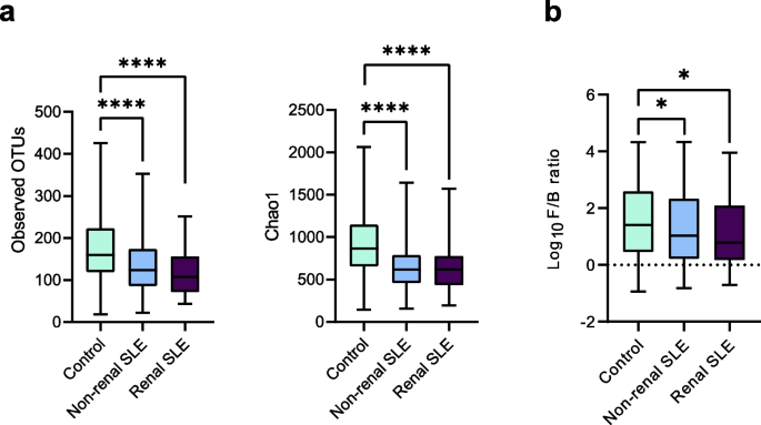 实验目的是解析SLE患者泌尿微生物组的分类组成与功能通路变化,筛选与肾脏受累相关的差异特征。方法细节:提取尿液细菌沉淀中的DNA,采用融合通用引物扩增16S rRNA基因的V1-V3区,使用Illumina MiSeq平台进行双端测序;利用Mothur软件进行质量控制与嵌合体去除,基于SILVA数据库进行分类学注释,通过PICRUSt工具进行功能预测,将基因家族映射至KEGG通路。结果解读:测序共获得11059442条有效reads,平均每个样本的测序深度为18900 reads,样本覆盖率均超过99%,满足后续分析要求。Alpha多样性分析显示,非肾性与肾性SLE患者的观测操作分类单元数(p<0.0001,n=585)和Chao1指数(p<0.0001,n=585)均显著低于健康对照,提示SLE患者泌尿微生物组多样性降低;门水平分析显示,SLE患者厚壁菌门/拟杆菌门比值显著降低(p<0.05,n=585),微生物组组成失调;PERMANOVA分析表明三组人群的微生物组组成存在显著差异(p=0.0035,n=585)。