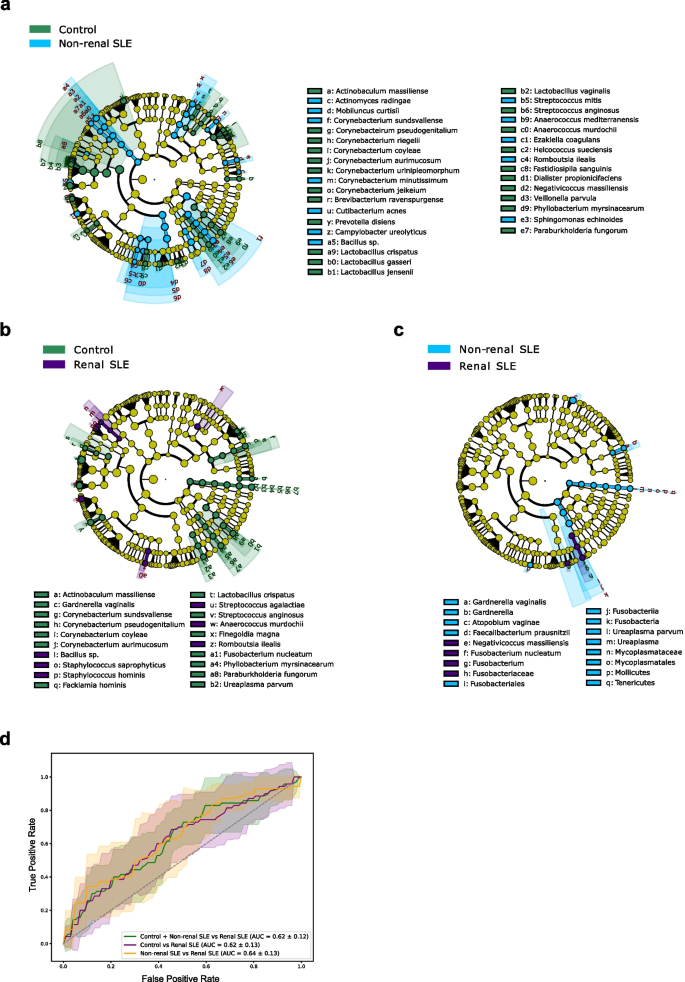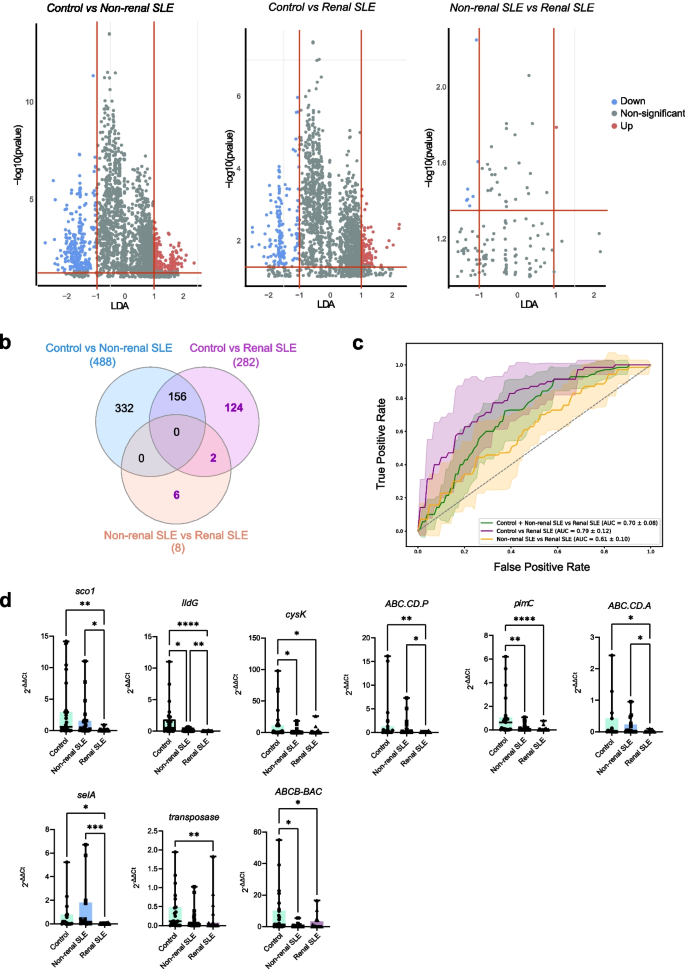 实验目的是筛选出可区分不同研究组的微生物分类群与功能基因,为后续诊断模型构建提供候选标志物。方法细节:采用线性判别分析效应大小(LEfSe)方法筛选差异操作分类单元(OTUs),设置p<0.05、线性判别分析(LDA)值>2.0为显著阈值;通过MaAsLin2分析筛选差异KEGG通路,利用BLAST分析鉴定差异OTUs对应的具体细菌物种。结果解读:LEfSe分析显示,非肾性SLE与健康对照相比有34个差异OTUs,肾性SLE与对照相比有20个差异OTUs,非肾性与肾性SLE之间有6个差异OTUs;功能通路分析显示,非肾性SLE患者的氨基酸代谢通路(如缬氨酸、亮氨酸和异亮氨酸生物合成)显著富集,而肾性SLE患者这些通路无显著变化,提示泌尿微生物组的功能变化与SLE肾脏受累密切相关。