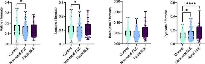 实验目的是验证微生物功能通路变化对应的尿液代谢物水平差异,揭示微生物组与宿主代谢的关联。方法细节:采用核磁共振(NMR)技术检测400名受试者的尿液代谢物,使用Chenomx Profiler软件进行代谢物的鉴定与定量,将代谢物浓度归一化后进行组间差异分析。结果解读:非肾性SLE患者尿液中缬氨酸(p<0.0001,n=400)、亮氨酸(p<0.001,n=400)水平显著低于健康对照,丙酮酸水平显著升高(p<0.0001,n=400),而肾性SLE患者无此变化;结合微生物功能通路分析结果,提示非肾性SLE患者泌尿微生物对支链氨基酸的降解增强,导致宿主尿液中氨基酸水平降低、丙酮酸水平升高,这一代谢变化可能与免疫调节异常相关。