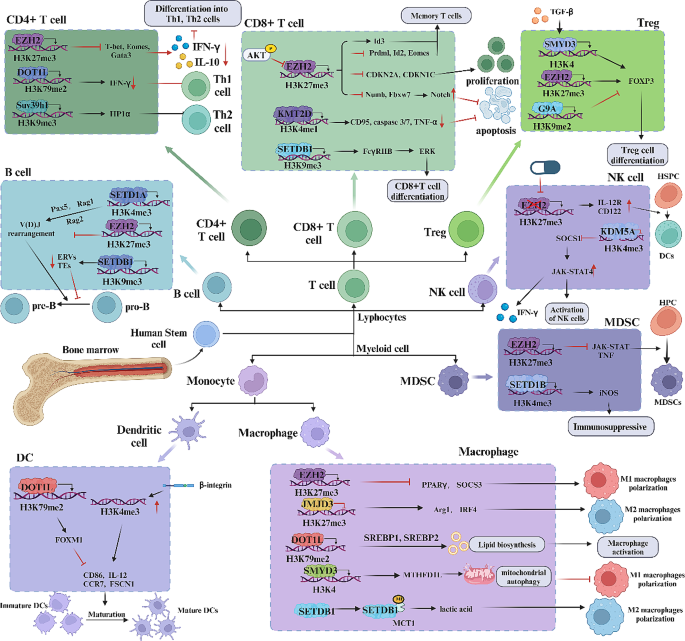 结果解读:在CD8+T细胞中,EZH2通过H3K27me3修饰激活Id3并抑制Id2、Prdm1等基因,促进记忆前体细胞的形成与分化;KMT2D通过调控凋亡相关基因增强子区的H3K4me1水平,维持激活诱导的CD8+T细胞存活。在Th细胞中,EZH2通过H3K27me3修饰抑制Th1/Th2细胞特异性转录因子的表达,阻碍其分化;DOT1L通过H3K79me2修饰抑制Th1细胞分化,维持谱系稳定性。在Tregs细胞中,EZH2通过H3K27me3修饰维持Foxp3的表达,维持其免疫抑制表型;SMYD3通过H3K4me3修饰促进Foxp3的表达,诱导诱导性Tregs(iTregs)的分化。在B细胞中,H3K4me3修饰参与免疫球蛋白重链(IgH)基因座的V(D)J重组,调控B细胞的发育与成熟。在NK细胞中,H3K4me3去甲基化酶KDM5A通过抑制SOCS1的表达,促进STAT4的磷酸化与核定位,增强NK细胞的激活与IFN-γ的分泌。在TAMs中,EZH2通过H3K27me3修饰抑制PPARγ、SOCS3等基因的表达,促进M1型巨噬细胞极化;JMJD3通过H3K27me3去甲基化促进M2型巨噬细胞标记基因的表达,诱导M2极化。在MDSCs中,EZH2通过H3K27me3修饰抑制Jak-STAT和TNF信号通路,阻碍其分化;SETD1B通过H3K4me3修饰促进iNOS的表达,增强其免疫抑制功能。在DCs中,DOT1L通过H3K79me3修饰促进FOXM1的表达,抑制DCs的成熟;β2-整合素通过上调H3K4me3水平促进DCs成熟相关基因的表达,增强其抗原呈递功能。