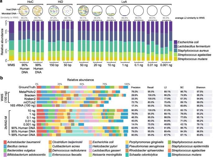 方法细节:构建包含5种常见口腔/肠道细菌的模拟群落(Mock-CAS),制备三类复杂样本:低生物量系列(总DNA量从50ng梯度降至1pg)、高降解系列(DNA被DNAse I随机剪切为150bp和50bp片段)、高宿主污染系列(添加人DNA模拟90%和99%的宿主污染),每个条件设置3个技术重复;对所有样本进行2bRAD-M测序,以100ng样本的WMS结果作为阳性对照,用Centrifuge工具分析测序数据,评估L2相似度、重复性等指标。