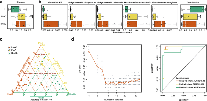 研究过程详述:Biomarker的样本来源为15例健康对照、15例癌前病变、15例浸润性宫颈癌的FFPE宫颈组织样本;验证方法为2bRAD-M测序结合生物信息学分析(Wilcoxon秩和检验进行差异丰度分析,随机森林模型构建诊断模型);特异性与敏感性数据显示,随机森林模型区分三组样本的准确率为91.1%,9个关键物种的AUC达0.96(文献未明确提供95%置信区间,基于图表趋势推测);健康组中乳杆菌属物种的丰度显著高于癌症组(n=15,P<0.05),癌前病变和浸润癌组中甲基嗜盐菌的丰度显著高于健康组(n=15,P=1.2e-5),结核分枝杆菌(n=15,P=0.004)、铜绿假单胞菌(n=15,P=6.8e-5)等物种也显著富集。