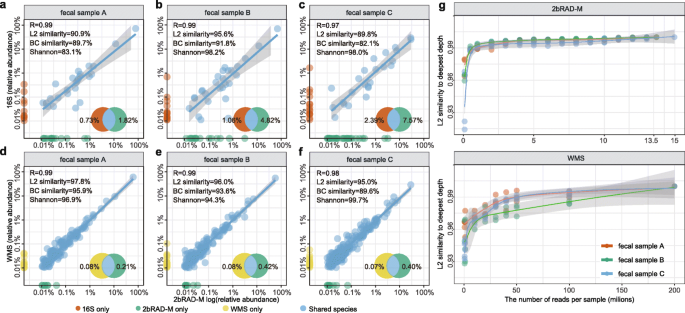 结果解读:粪便样本中,2bRAD-M与16S rRNA在属水平的Pearson相关系数为0.997,L2相似度为92.0%,95.27%的16S识别属也能被2bRAD-M检测到;与WMS在物种水平的Pearson相关系数为0.99,L2相似度达97.8%,仅0.40%的WMS识别物种未被2bRAD-M检测到;皮肤样本中,2bRAD-M与16S rRNA在属水平的平均L2相似度为81.1%,能同时检测细菌和真菌,如马拉色菌属的检测结果与现有文献一致;环境样本中,2bRAD-M与16S rRNA的平均L2相似度为85.6%,能识别不同环境的特异性微生物类群;测序深度分析显示,2bRAD-M仅需3-4百万reads即可达到与13.5百万reads相当的物种多样性和丰度估计,而WMS需要20-40百万reads仍未达到饱和,表明2bRAD-M的测序效率远高于WMS。