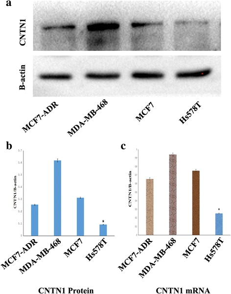 方法细节:选取MCF7-ADR、MDA-MB-468、MCF7和Hs578T四种乳腺癌细胞系,采用蛋白质免疫印迹(Western blot)和实时荧光定量PCR(qRT-PCR)检测CNTN1的蛋白和mRNA表达水平,实验重复三次。