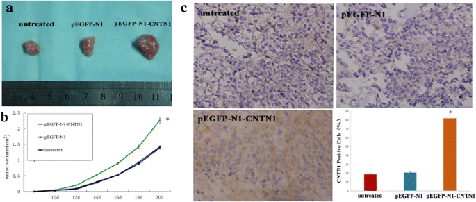 方法细节:将5周龄的裸鼠随机分为三组,每组6只(n=6),分别皮下注射未处理的Hs578T细胞、转染空载体的Hs578T细胞和转染CNTN1过表达质粒的Hs578T细胞;肿瘤形成后每2天用游标卡尺测量肿瘤大小,计算肿瘤体积;三周后处死小鼠,取出肿瘤并测量肿瘤重量,采用免疫组化(IHC)检测肿瘤组织中CNTN1的表达。