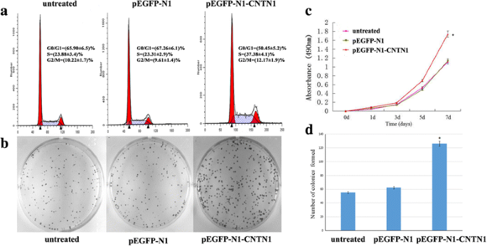 结果解读:MTT实验结果显示,CNTN1过表达组的OD值显著高于对照组(n=3,P<0.05),提示细胞增殖活性增强;克隆形成实验结果显示,CNTN1过表达组的克隆数显著多于对照组,提示细胞克隆形成能力增强;流式细胞术结果显示,CNTN1过表达组中处于S期的细胞比例显著升高,G1期细胞比例降低,提示CNTN1促进细胞周期从G1期向S期转换,加速细胞增殖。