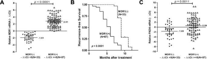 实验目的是明确肝细胞癌患者肿瘤组织中PADI4表达与化疗耐药及预后的相关性;方法细节是收集120例接受手术联合经导管动脉化疗栓塞(TACE)的肝细胞癌患者手术前后静脉血样本,采用实时荧光定量PCR检测外周血中MDR1 mRNA表达,将MDR1表达升高的患者归为耐药组(MDR1+,87例),表达降低的归为敏感组(MDR1-,33例),同时检测患者肿瘤组织中PADI4 mRNA表达,并采用Kaplan-Meier法分析两组患者的无进展生存期;结果解读:耐药组肿瘤组织中PADI4 mRNA表达显著高于敏感组(Mean -∆Ct ± SD = 0.59 ± 0.37 vs -1.69 ± 0.53,n=120,P=0.0011),Kaplan-Meier分析显示耐药组无进展生存期显著短于敏感组(中位生存期6个月vs9个月,n=120,P<0.0001,风险比HR=6.339,95%置信区间CI:3.742-10.74),提示PADI4高表达与肝细胞癌化疗耐药及不良预后密切相关;实验所用关键产品:实时荧光定量PCR系统(Stratagene Mx3000P),TRIzol试剂(领域常规使用Invitrogen产品)。