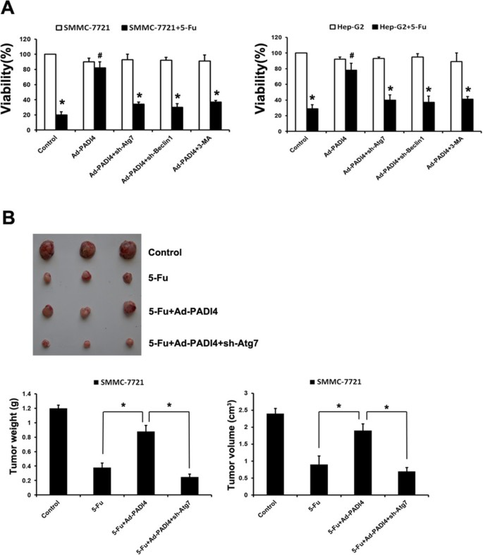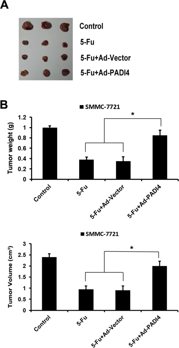 实验目的是在体内验证PADI4对肝细胞癌化疗耐药的调控作用;方法细节是将过表达PADI4的SMMC-7721细胞(5×10^6个)皮下接种于裸鼠腋窝部位,待肿瘤体积达到一定大小后,每3天瘤内注射5-Fu(30mg/kg),连续处理27天后处死小鼠,剥离肿瘤并检测肿瘤重量和体积;结果解读:与对照组相比,PADI4过表达组肿瘤重量和体积显著增大(n=6,P<0.05),表明PADI4在体内同样可增强肝细胞癌的化疗耐药性;实验所用关键产品:SPF级裸鼠(领域常规使用北京维通利华或上海斯莱克产品),5-Fu(齐鲁制药)。