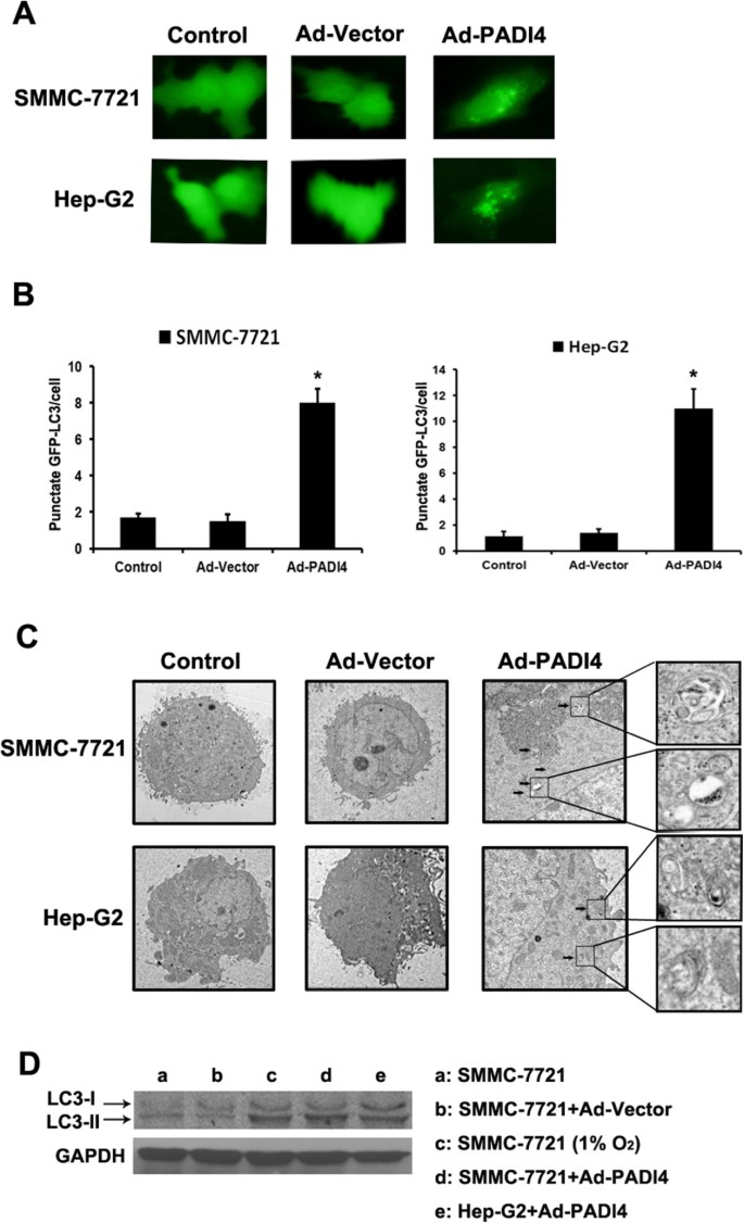 实验目的是明确PADI4是否可诱导肝细胞癌细胞发生自噬;方法细节是采用Fugene HD转染试剂将GFP-LC3质粒转染至SMMC-7721和Hep-G2细胞,AdPADI4处理24小时后,荧光显微镜下观察GFP-LC3点状聚集情况;采用透射电镜观察细胞内自噬体超微结构;采用蛋白质免疫印迹(Western blot)检测LC3-I/LC3-II蛋白表达水平;结果解读:PADI4过表达后,GFP-LC3点状聚集细胞比例显著升高(n=3,P<0.05),透射电镜下可见大量双层膜结构的自噬体,Western blot结果显示LC3-II/LC3-I比值显著升高,表明PADI4可诱导肝细胞癌细胞发生自噬;实验所用关键产品:GFP-LC3质粒(领域常规使用Addgene产品),Fugene HD转染试剂(Roche,Cat.04709705001),透射电镜(Philips CM-120),PADI4抗体(Abcam,1:1000),LC3抗体(Novus Biologicals,1:1000),ECL发光试剂(Beyotime)。