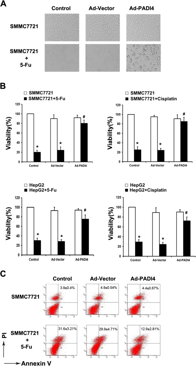 实验目的是在体外验证PADI4过表达是否增强肝细胞癌细胞的化疗耐药性;方法细节是构建携带PADI4基因的腺病毒载体(AdPADI4),以空载腺病毒(Ad-Vector)为对照,感染人肝细胞癌细胞系SMMC-7721和Hep-G2,采用MTT法检测5-氟尿嘧啶(5-Fu)和顺铂处理后的细胞活力,采用流式细胞术(PI/Annexin V-PE双染色)检测细胞凋亡率;结果解读:与对照组相比,PADI4过表达组在5-Fu或顺铂处理后细胞活力显著升高(n=3,P<0.05),凋亡率显著降低(n=3,P<0.05),表明PADI4过表达可增强肝细胞癌细胞对化疗药物的耐药性;实验所用关键产品:AdPADI4腺病毒载体(上海吉凯基因),MTT试剂(Sigma,Cat.M2003),PI/Annexin V-PE凋亡检测试剂盒(凯基生物,Cat.KGA108),BD FACSAria流式细胞仪。