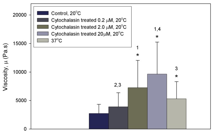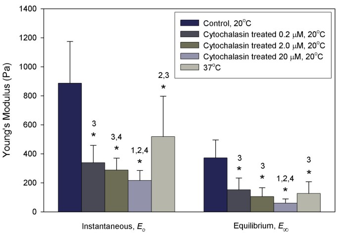 );瞬时杨氏模量和平衡杨氏模量较对照组降低67%-84%(P<0.001,文献未明确提供该数据的样本量,基于图表趋势推测),0.2μM至2.0μM浓度组间无显著差异(P>0.1,文献未明确提供该数据的样本量,基于图表趋势推测);表观黏度较对照组增加最高255%(P<0.05,文献未明确提供该数据的样本量,基于图表趋势推测)(