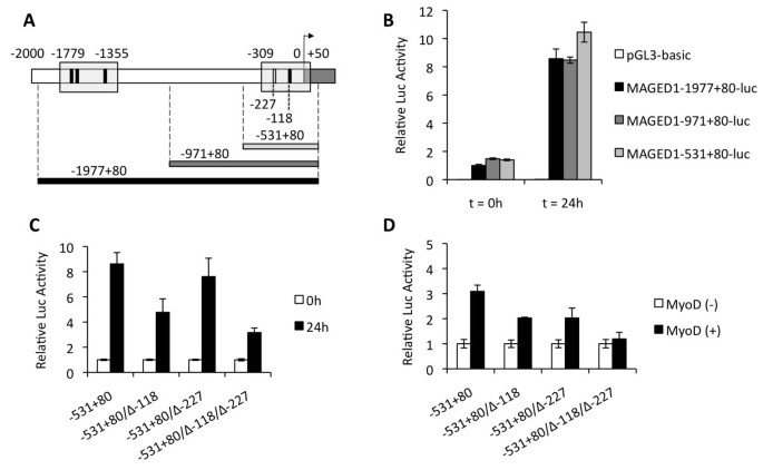 实验目的:探究Maged1在成肌分化中表达上调的转录调控机制。方法细节:通过生物信息学分析人、小鼠、猪、犬的Maged1启动子区域,寻找保守的E-box序列;构建包含不同长度Maged1启动子片段的荧光素酶报告基因载体,转染C2C12细胞,检测分化前后的荧光素酶活性;通过定点突变E-box序列验证其功能,并在NIH-3T3细胞中过表达MyoD,检测其对Maged1启动子的激活作用。结果解读:生物信息学分析显示Maged1启动子区域存在4个保守的E-box序列,其中近端的-227和-118位E-box在哺乳动物中高度保守;包含-531至+80片段的启动子载体在C2C12分化后荧光素酶活性上调约10倍,与全长启动子活性相当;突变-118位E-box后,分化诱导的荧光素酶活性显著降低;在NIH-3T3细胞中过表达MyoD可使Maged1启动子活性上调3倍,表明MyoD通过结合E-box序列激活Maged1的转录(图2)。产品关联:实验所用关键产品:Promega的Dual Luciferase Reporter Assay试剂盒、Fermentas的ExGen500转染试剂等。