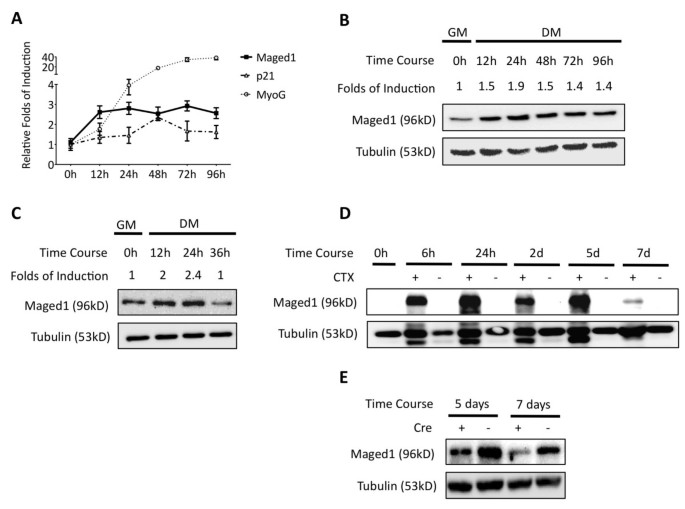 实验目的:明确Maged1在成肌细胞分化及损伤后肌肉再生过程中的表达动态。方法细节:采用C2C12成肌细胞系和原代小鼠成肌细胞,通过血清饥饿诱导分化,在0、24、48、72、96小时采用实时荧光定量PCR(qRT-PCR)和免疫印迹(Western blot)检测Maged1的RNA和蛋白水平;同时建立小鼠胫骨前肌(TA)肉毒毒素(CTX)损伤模型,在损伤后不同时间点采用免疫印迹检测Maged1蛋白表达,并通过肌细胞特异性敲除Maged1的小鼠明确其细胞来源。结果解读:在C2C12细胞中,Maged1在增殖期低表达,血清饥饿诱导分化后24小时RNA和蛋白水平分别上调3倍和2倍,并维持至分化结束;原代成肌细胞分化后Maged1蛋白水平上调2倍;野生型小鼠TA肌肉损伤后6小时Maged1蛋白显著诱导表达,而肌细胞特异性敲除Maged1的小鼠中Maged1诱导水平显著降低,表明Maged1的诱导表达主要来源于分化的肌细胞(图1)。产品关联:实验所用关键产品:BD Sciences的Maged1抗体(货号612500)、Qiagen的RNeasy mini试剂盒、Applied Biosystems的Power SYBR Green PCR Master Mix等。