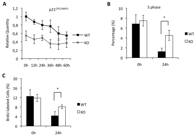 实验目的:明确Maged1调控成肌分化的下游分子机制,重点探究细胞周期退出的调控。方法细节:采用qRT-PCR检测野生型和Maged1敲除成肌细胞中肌源性调控因子MyoD、肌生成素(MyoG)、Mef2C及细胞周期抑制剂p21的RNA水平;通过流式细胞术分析细胞周期分布,采用BrdU掺入实验检测细胞增殖活性。结果解读:Maged1敲除成肌细胞中MyoD、MyoG、Mef2C的RNA水平与野生型无显著差异,但p21的RNA水平在增殖期和分化期均显著降低(n=3,P<0.05);流式细胞术显示,分化24小时后,Maged1敲除细胞中S期细胞比例是野生型的3倍(n=3,P<0.01);BrdU掺入实验显示,Maged1敲除细胞的BrdU阳性比例是野生型的2倍(n=3,P<0.01),表明Maged1缺失导致成肌细胞无法有效退出细胞周期,进而影响终末分化(图4)。产品关联:实验所用关键产品:BD Sciences的BrdU抗体(货号555627)、Invitrogen的TOPRO-3染色剂等。
