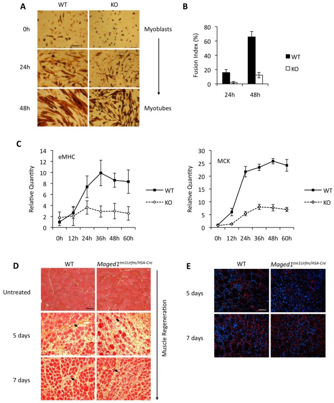 实验目的:验证Maged1在成肌分化与体内肌肉再生中的功能。方法细节:分离野生型和Maged1全身敲除小鼠的原代成肌细胞,血清饥饿诱导分化,通过免疫组化(IHC)检测肌球蛋白重链(MHC)表达,计算融合指数(多核肌管中核的比例),采用qRT-PCR检测晚期分化标志物胚胎肌球蛋白重链(eMHC)和肌酸激酶(MCK)的表达;同时构建肌细胞特异性Maged1敲除小鼠,通过CTX诱导TA肌肉损伤,在损伤后5天和7天采用苏木精-伊红(H&E)染色和层粘连蛋白免疫组化分析肌肉再生情况,测量新生肌纤维的横截面积。结果解读:Maged1缺失的原代成肌细胞在分化48小时后仅形成少量细肌管,融合指数在24小时和48小时均显著低于野生型细胞(n=3,P<0.01);eMHC和MCK的RNA水平显著降低(n=3,P<0.05);体内实验中,肌细胞特异性敲除Maged1的小鼠在损伤后5天新生肌纤维数量少且横截面积比野生型小47%(44±7 μm² vs 82±9 μm²,n=3,P<0.01),7天时差异仍存在但有所缩小(图3)。产品关联:实验所用关键产品:Santa Cruz的MHC抗体(货号Sc-20641)、Sigma-Aldrich的层粘连蛋白抗体(货号L9393)等。