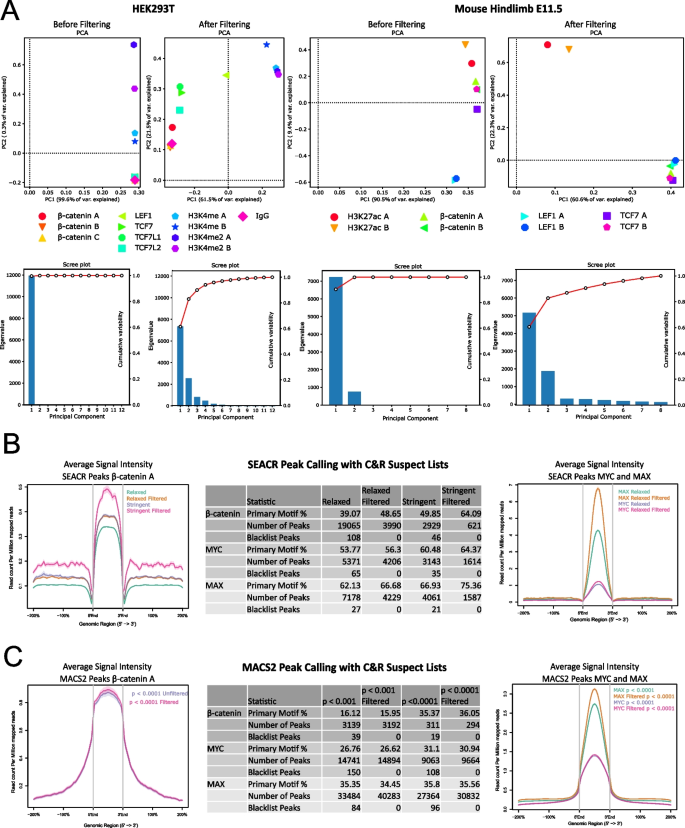 方法细节:下载已发表的CUT&RUN数据集,包括人类HEK293T细胞和小鼠后肢组织中的组蛋白修饰、转录因子及共因子的结合数据;在峰识别前,使用Bedtools去除比对到可疑区域的reads,分别采用SEACR(严格和宽松模式)和MACS2(不同统计阈值)进行峰识别;比较过滤前后的PCA聚类结果、峰的信号强度、预期基序富集度等指标,评估数据质量的提升。