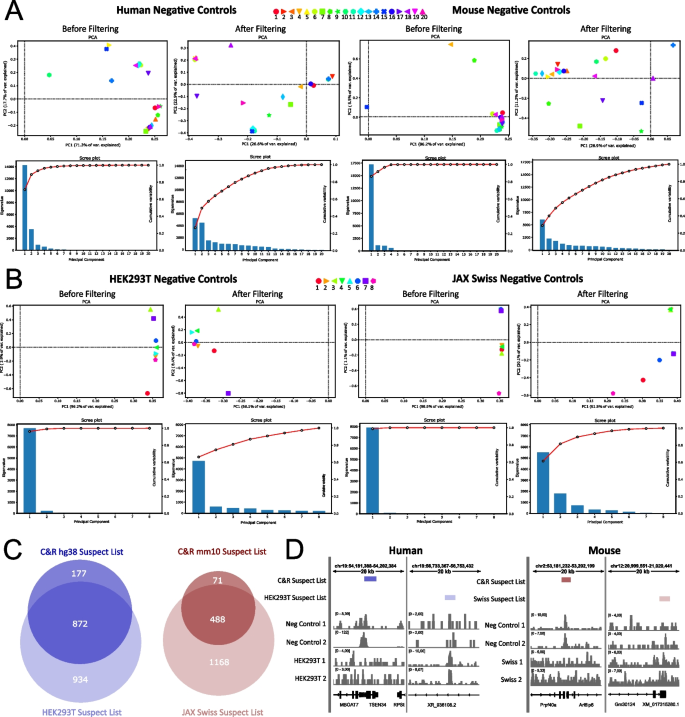 方法细节:在人类HEK293T细胞和小鼠JAX Swiss胚胎组织中各进行8次CUT&RUN阴性对照实验,采用IgG或anti-HA作为对照抗体,同时使用原始CUT&RUN和C&R-LoV-U两种实验流程;对这些实验数据进行生物信息学分析,构建细胞/组织特异性的可疑区域列表,与通用可疑列表进行重叠分析;采用deepTools进行主成分分析(PCA),比较过滤可疑列表前后样本的基因组信号分布和方差变化。