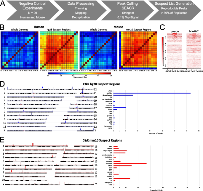 结果解读:人类hg38可疑列表包含1049个区域,小鼠mm10列表包含559个区域,这些区域平均长度约5000bp,覆盖全基因组所有染色体及线粒体基因组。相关性分析显示,阴性对照数据集在全基因组范围内的Spearman相关系数极低(符合随机信号分布),但在可疑区域内的相关系数显著升高,表明这些区域在不同实验中重复出现非特异性富集,属于假阳性区域。采用更严格的bowtie比对(不允许错配和多比对)后,可疑区域的信号富集仍显著高于背景,排除了比对偏差导致假阳性的可能性。基因组注释显示,人类可疑区域主要为卫星和简单重复区域,小鼠可疑区域则更多分布在基因间区域。