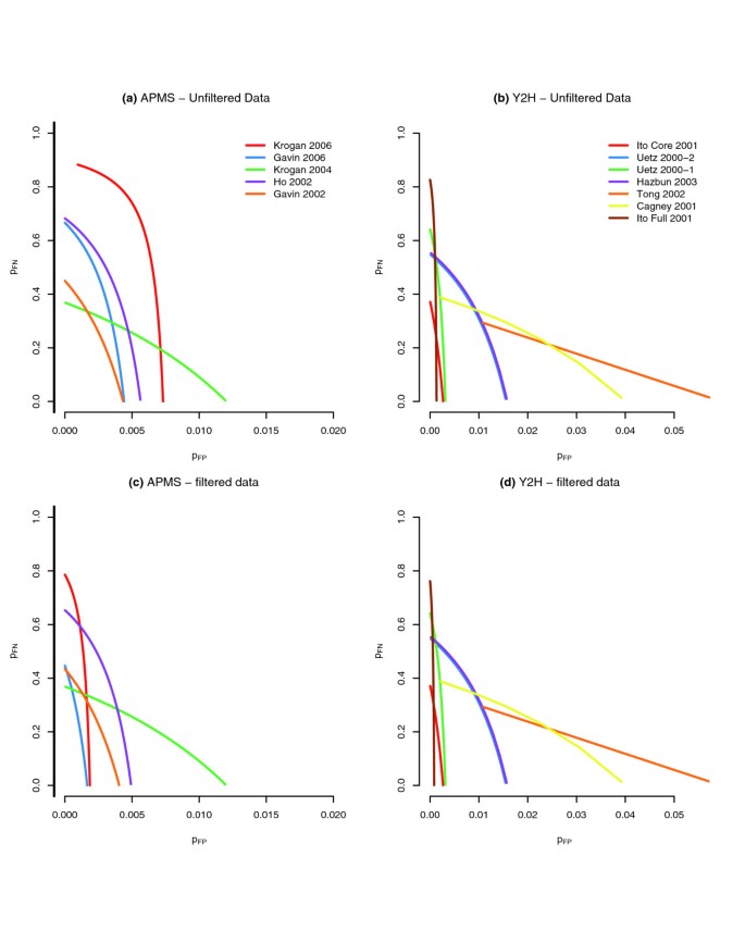 结果解读:模型分析显示,随机误差率可通过三维空间中的一维曲线表征,当过滤掉存在系统偏差的蛋白质后,P_FP和P_FN的估计值显著降低,说明系统偏差对随机误差的估计有较大影响;以Ito-Full数据集为例,在P_FN=0的假设下,P_FP约为0.0008,预期未互惠假阳性相互作用数为414,互惠假阳性为0.17,说明互惠的相互作用更可能是真实的;如图6所示,该图展示了各数据集的(P_FP,P_FN)解曲线,过滤系统偏差蛋白质后,曲线向原点方向移动,表明误差率降低,数据质量提升。