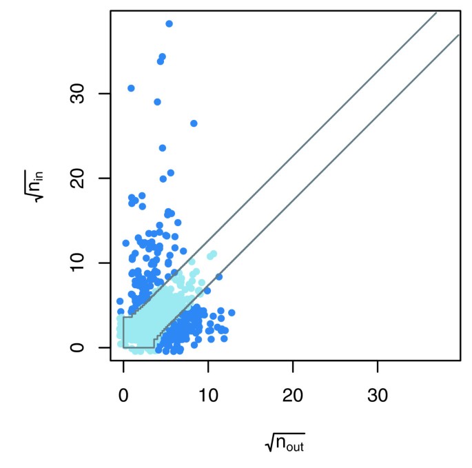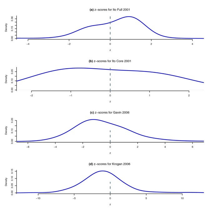结果解读:统计结果显示,Y2H实验和小规模AP-MS实验中,存在系统偏差的VBP蛋白质比例较低(<3%),而两个大规模AP-MS实验中该比例较高(>14%);在AP-MS数据中,密码子适应指数(CAI)和蛋白质丰度与VBP蛋白质的未互惠入度显著相关,高CAI的蛋白质更容易被作为猎物检测到,导致入度偏高;如图3所示,该散点图展示了Krogan等数据集中二项检验的结果,偏离对角线的蛋白质表示未互惠入度和出度存在显著差异,即存在系统偏差;如图4所示,Gavin等数据集的邻接矩阵按CAI排序后出现明显的垂直暗带,说明高CAI的蛋白质作为猎物被检测到的频率更高;如图5所示,入度z分数的密度分布显示,Ito-Full数据集的z分数均值显著偏高,与数据中存在大量自激活诱饵有关,而Ito-Core数据集通过筛选消除了该效应,z分数分布更接近正态分布。