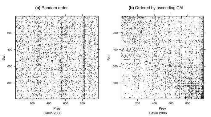 方法细节:针对双向测试的VBP蛋白质,采用二项误差模型,假设未互惠的入度(作为猎物被检测到的次数)和出度(作为诱饵检测到猎物的次数)概率相等,通过双侧二项检验(P<0.01)识别存在系统偏差的蛋白质;采用逻辑回归模型分析存在系统偏差的蛋白质与31种蛋白质属性(如密码子适应指数CAI、蛋白质丰度)的关联;通过邻接矩阵可视化CAI与蛋白质未互惠入度的关联,将矩阵的行和列按CAI升序排列,观察相互作用的分布模式。