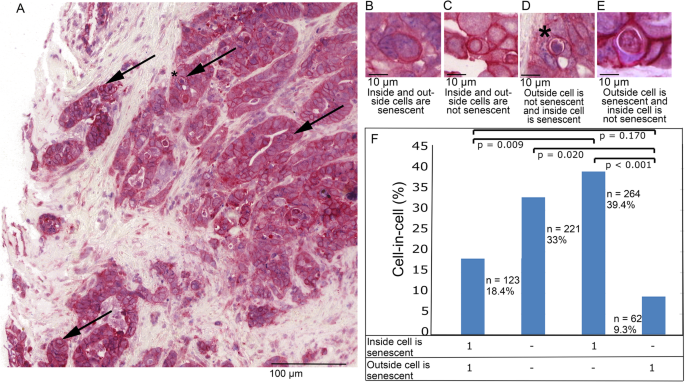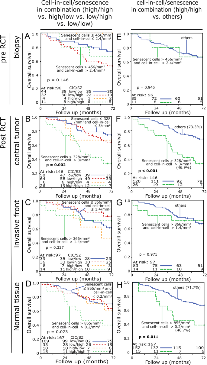 本环节的实验目的是分析衰老细胞与CIC对直肠癌患者预后的影响,以及两者在临床样本中的关联模式。实验方法为通过受试者工作特征(ROC)曲线确定衰老细胞数与CIC数的cutoff值,采用Kaplan-Meier法分析总生存期、无转移生存期等预后指标,Cox回归模型分析独立预后因素;同时统计所有CIC结构中衰老细胞的参与比例。结果显示,低衰老细胞数的患者总生存期显著更优,活检样本中低衰老细胞组5年总生存期为78.5%,高组为61.2%(P=0.045),中心肿瘤区低组为80%,高组为76.8%(P=0.043);低CIC数的患者总生存期更优,中心肿瘤区低组5年总生存期为73.3%,高组为46.9%(P=0.001);67%的CIC结构中涉及衰老细胞,其中衰老细胞被非衰老细胞吞噬占39.4%,两者均为衰老细胞占18.4%,非衰老细胞被衰老细胞吞噬仅占9.3%(P<0.001);联合高衰老细胞数与高CIC数的患者预后极差,且该联合指标是总生存期的独立不良预后因素(P=0.001)。