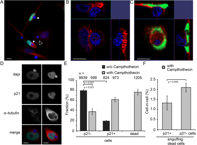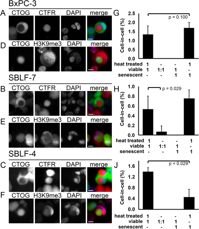 本环节的实验目的是明确细胞衰老是否可触发非专业吞噬,以及衰老细胞自身是否具备非专业吞噬能力。实验方法为将H3K9me3阳性的衰老细胞分别与活细胞、坏死细胞共孵育,通过免疫荧光染色观察细胞内结构(CIC)形成事件,计数不同细胞组合的吞噬率。结果显示,体外实验中未观察到衰老细胞被活细胞吞噬的现象,也未观察到活细胞或衰老细胞吞噬活细胞的情况;但衰老细胞吞噬坏死细胞的频率与非衰老活细胞相当(0.95%),且p21阳性的衰老细胞吞噬坏死细胞的比例为1.3%,显著低于非衰老细胞的2.1%(P=0.043)。实验所用关键产品:抗H3K9me3抗体(Millipore)、CellTrace Oregon Green(CTOG,Invitrogen)、CellTrace Far Red(CTFR,Invitrogen)。