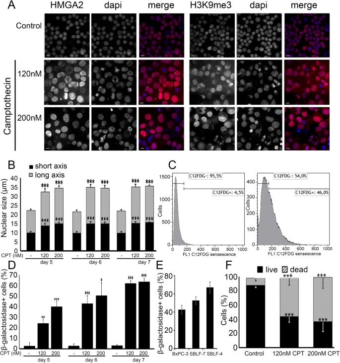 本环节的实验目的是用喜树碱(CPT)诱导细胞衰老并验证衰老表型。实验方法为用120nM与200nM CPT处理BxPC-3胰腺癌细胞6天,通过免疫荧光检测衰老标志物高迁移率族AT-hook 2(HMGA2)与组蛋白H3第9位赖氨酸三甲基化(H3K9me3)的表达,流式细胞术检测C₁₂FDG标记的β-半乳糖苷酶活性,测量细胞核长径与短径,并用Annexin V/7AAD染色检测细胞死亡情况。结果显示,CPT处理后细胞细胞核明显增大,HMGA2与H3K9me3的免疫荧光染色模式发生显著改变;120nM CPT处理6天后,BxPC-3细胞的β-半乳糖苷酶阳性率为42.7%±4.7%,SBLF-7成纤维细胞为52.7%±4.2%,SBLF-4成纤维细胞为67.1%±6.0%(n=3,P<0.05);p21阳性的衰老细胞比例从19.9%升至80.1%(P=0.021),且处理7天后细胞死亡比例升高。实验所用关键产品:喜树碱(CPT)、抗HMGA2抗体、抗H3K9me3抗体(Millipore)、抗p21抗体(Cell Signaling)、C₁₂FDG(Invitrogen)、Annexin V-APC、7AAD。