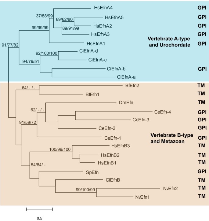 ephrin配体的系统发育树可分为两个主要分支,一个分支包含非脊索动物、头索动物的ephrin以及尾索动物与脊椎动物的ephrin-B,另一个分支包含尾索动物与脊椎动物的ephrin-A,bootstrap检验显示ephrin-A分支的支持度较高,而ephrin-B相关的无脊椎类群分支支持度较低(图2)。