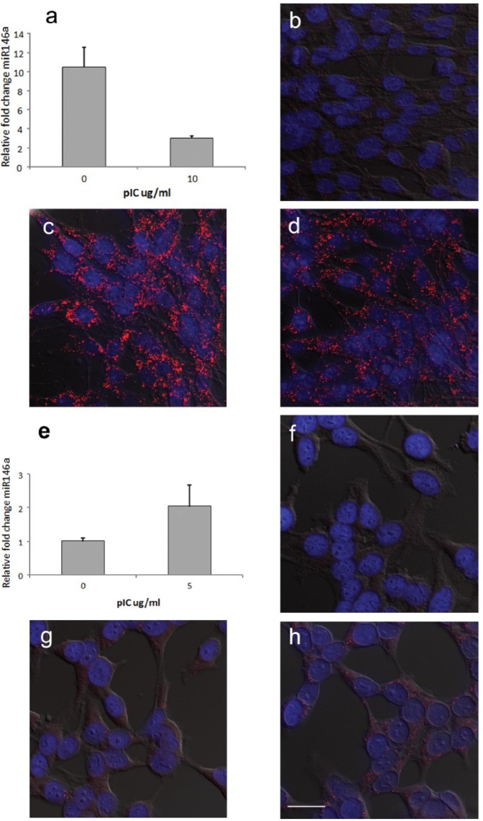 实验目的是验证O-FISH技术对小长度核酸(如miRNA,约20nt)的检测能力,选择miR146a作为靶标,其表达与I型干扰素调控相关。方法细节:用19nt的生物素标记探针检测鸡DF1成纤维细胞和人HeLa细胞中miR146a的表达,采用聚肌苷酸-聚胞苷酸(pIC)处理细胞以调控miR146a水平,同时用qRT-PCR进行定量验证,设置无探针的阴性对照(对应图8)。结果解读:O-FISH检测的miR146a信号变化与qRT-PCR结果完全一致:pIC处理后DF1细胞中miR146a表达下调,HeLa细胞中表达上调;无探针对照组仅检测到极低背景信号,证明O-FISH可特异性检测长度约20nt的miRNA分子。实验所用关键产品:Sigma-Aldrich的Tri-reagent RNA提取试剂、Invitrogen的Lipofectamine 2000转染试剂、Applied Biosystems的SYBR Green qPCR试剂。