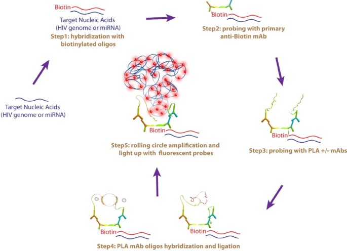 研究过程详述:HIV-1核酸的来源为HIV-1感染的MT-2、Jurkat淋巴细胞,采用O-FISH技术进行原位检测,通过未感染细胞对照、AZT抑制实验验证特异性,灵敏度可达1-2拷贝/细胞;miR146a的来源为鸡DF1成纤维细胞和人HeLa细胞,采用O-FISH与qRT-PCR联合验证,无探针对照显示背景信号极低,检测结果与qRT-PCR的一致性证明了方法的准确性(文献未明确提供ROC曲线、敏感性等数据)。