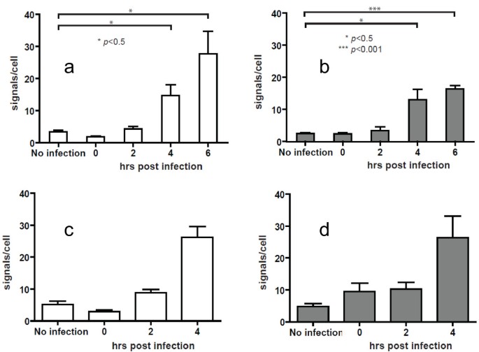 实验目的是探索O-FISH技术在核酸结构与构象动态研究中的应用潜力,基于HIV-1 RNA在复制周期中存在结构重排的假说进行验证。方法细节:针对HIV-1 RNA 5’非翻译区(UTR)的U5/引物结合位点(PBS)序列设计24nt探针,检测感染后0、2、4小时细胞内的O-FISH信号变化,分析探针结合位点的可及性(对应图7)。结果解读:感染后2小时细胞内的O-FISH信号显著高于0和4小时,提示该时间段内HIV-1 RNA的U5/PBS区域处于暴露状态,而0和4小时因tRNA结合或RNaseH降解导致位点被遮蔽;这一结果为HIV-1 RNA的结构重排假说提供了原位实验证据,证明O-FISH可用于分析核酸构象的动态变化。文献未提及具体实验产品,领域常规使用核酸探针合成服务、共聚焦荧光显微镜成像系统。
