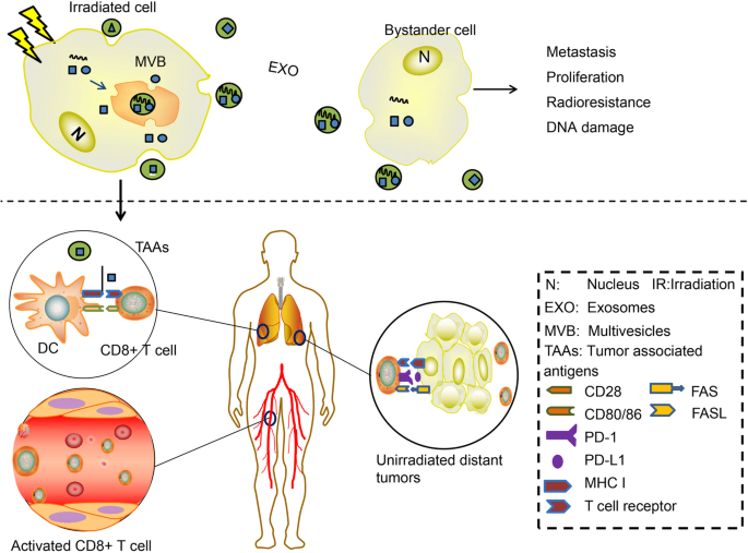 结果解读:远隔效应是放疗诱导的系统性抗肿瘤效应,依赖免疫系统介导,外泌体可作为放疗诱导的信号载体,将TAAs、dsDNA、miRNA等分子传递到未照射部位的细胞,激活DC的成熟与抗原提呈功能,进而促进CD8+T细胞的活化与迁移,识别并杀伤未照射部位的肿瘤细胞。例如,在乳腺癌模型中,放疗诱导的外泌体可将dsDNA传递给DC,激活STING-IFN-I通路,诱导系统性抗肿瘤免疫应答,介导远隔效应。