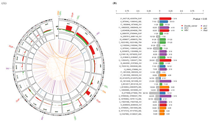 实验目的是解析台湾HCC的拷贝数变异(CNAs)和结构变异(SVs)特征,明确其与病因、预后的关联;方法细节为通过生物信息学工具分析WGS数据中的CNAs和SVs,绘制热图和Circos图展示变异分布,按病因分组分析变异频率差异,进行生存关联分析;结果解读为台湾HCC最常见的染色体臂拷贝数变异包括1q、6p等的扩增,4q、8p等的缺失,17p缺失与更好的患者生存相关(P=0.05,n=254),7q扩增与更差的生存相关(P=0.053,n=254);共鉴定出17639个体细胞SVs,其中13个SVs与患者生存显著关联,不同病因组的SVs频率存在差异;产品关联:文献未提及具体实验产品,领域常规使用GISTIC、Manta等工具进行拷贝数与结构变异分析。