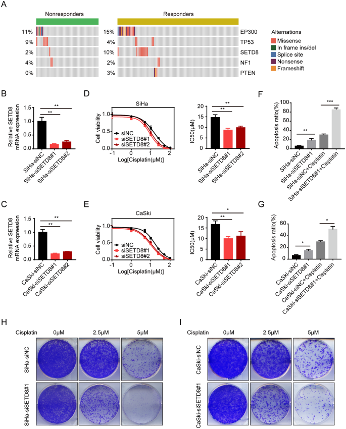 结果解读:敲减SETD8后,SiHa细胞对顺铂的IC50从14.71±0.75μM降至8.73±0.49μM(siSETD8#1,p=0.0027)和9.88±0.40μM(siSETD8#2,p=0.0049),CaSki细胞的IC50从16.69±0.97μM降至9.97±0.58μM(siSETD8#1,p=0.0040)和11.17±1.12μM(siSETD8#2,p=0.0239);顺铂诱导的细胞凋亡率显著升高,SiHa细胞从30.24%±2.00%升至84.92±2.96%(p=0.0001),CaSki细胞从29.61%±1.91%升至51.04%±4.84%(p=0.0146);不同浓度顺铂处理下,SETD8敲减细胞的克隆形成能力均显著降低。