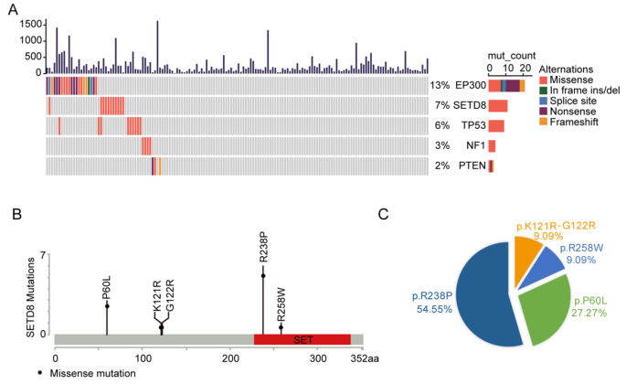 结果解读:在156例宫颈癌组织中,SETD8的突变频率为7%,其中化疗应答者中的突变频率(10%)高于非应答者;SETD8突变包括5种错义突变,其中R238P(54.55%)位于SETD8的SET功能结构域;TMB在SETD8突变组与野生型组之间无显著统计学差异(p=0.6562),提示SETD8突变与肿瘤突变负荷无直接关联。