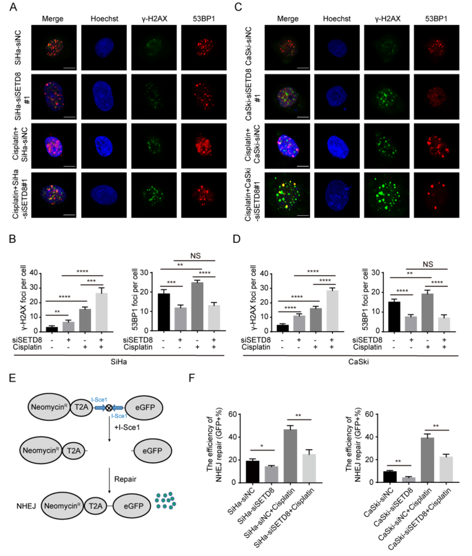 结果解读:敲减SETD8后,SiHa和CaSki细胞中H4K20me1和H4K20me2的表达水平均显著降低;H4K20me1/2与53BP1的共定位系数显著下降,SiHa细胞中H4K20me1的Pearson系数从0.53±0.03降至0.30±0.09;53BP1灶点数量显著减少,γ-H2AX灶点数量显著增加;NHEJ修复效率显著降低,SiHa细胞顺铂处理后GFP阳性率从46.36%±2.12%降至24.71%±2.46%(p=0.0026),CaSki细胞从39.00%±2.08%降至22.33%±1.45%(p=0.0041)。