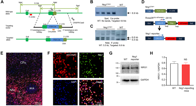 实验目的:构建能精准、特异性标记Nrg1阳性细胞的小鼠模型,确保标记结果能真实反映Nrg1的内源性表达。方法细节:利用CRISPR/Cas9基因编辑技术,在小鼠Nrg1基因的第9外显子终止密码子前插入P2A-Cre表达盒,构建Nrg1^{Cre/+}敲入小鼠;将Nrg1^{Cre/+}小鼠与Ai14(Rosa26^{LSL-tdTomato/+})报告小鼠杂交,获得Nrg1报告小鼠(Nrg1^{Cre/+}; Rosa26^{LSL-tdTomato/+}),其中tdTomato仅在Nrg1阳性细胞中表达;通过Southern blot验证基因插入的正确性,利用双荧光原位杂交(dFISH)检测tdTomato与Nrg1 mRNA的共定位,通过蛋白免疫印迹(Western blot)比较野生型与Nrg1报告小鼠纹状体中Nrg1蛋白的表达水平。结果解读:Southern blot结果显示,Spel酶切后靶向等位基因产生6.9kb片段,Ndel酶切后野生型与靶向等位基因分别产生5.5kb与6.6kb片段,证实P2A-Cre盒正确插入Nrg1基因座;dFISH结果显示,Nrg1报告小鼠伏隔核中94±1.2%的tdTomato阳性细胞同时表达Nrg1 mRNA,表明tdTomato能精准标记Nrg1阳性细胞;Western blot结果显示,野生型与Nrg1报告小鼠纹状体中Nrg1蛋白水平无显著差异(NS,n=3,非配对t检验),表明基因编辑未影响Nrg1的正常表达。