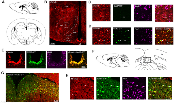 实验目的:解析Nrg1在丘脑、下丘脑与小脑的细胞类型特异性表达。方法细节:利用Nrg1报告小鼠结合Gad67-GFP小鼠,通过免疫荧光染色标记NeuN、GABA、Parvalbumin(PV,小脑浦肯野细胞标记),明确Nrg1阳性细胞的类型。结果解读:下丘脑Nrg1阳性细胞主要分布在腹内侧核(VM)、弓状核(ARC)、正中隆起(ME);VM中Nrg1阳性细胞与NeuN共定位,与Gad67-GFP无共定位,表明其为兴奋性神经元;ARC中约2/3的Nrg1阳性细胞与Gad67-GFP共定位,提示可能为AgRP神经元;ME中Nrg1阳性细胞几乎全为GABA能神经元;丘脑上丘(SC)中Nrg1阳性细胞主要为GABA能中间神经元;小脑Nrg1阳性细胞主要分布在浦肯野细胞层与分子层,与PV共定位,表明其主要为浦肯野细胞,同时在分子层的GABA能中间神经元中也有表达。