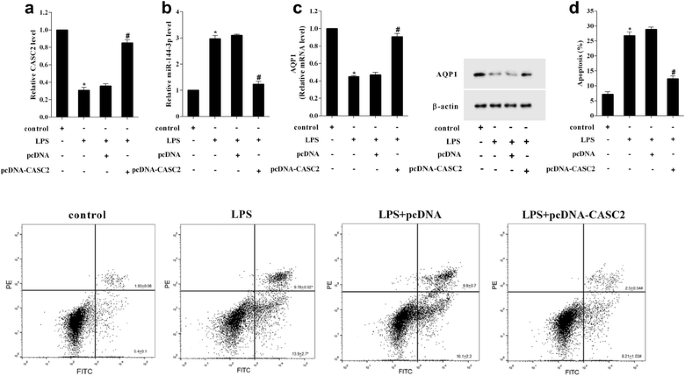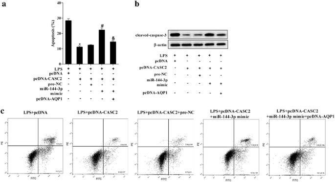 实验目的是验证CASC2是否通过调控miR-144-3p/AQP1轴抑制LPS诱导的肺上皮细胞凋亡,明确该调控轴的功能。方法细节为将A549细胞分为LPS组、LPS+pcDNA-CASC2组、LPS+pcDNA-CASC2+miR-144-3p模拟物组、LPS+pcDNA-CASC2+miR-144-3p模拟物+pcDNA-AQP1组,采用流式细胞术检测细胞凋亡率,蛋白质免疫印迹检测caspase-3的表达水平。结果解读显示,pcDNA-CASC2可显著降低LPS诱导的细胞凋亡率,而miR-144-3p模拟物可抵消CASC2的抑凋亡作用,pcDNA-AQP1则可恢复CASC2的抑凋亡作用;caspase-3的表达水平与凋亡率变化一致,证明LPS通过调控CASC2/miR-144-3p/AQP1轴诱导肺上皮细胞凋亡。