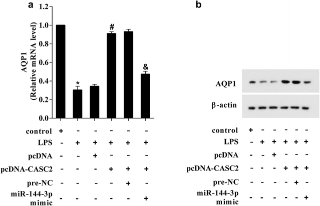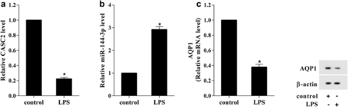 实验目的是检测LPS诱导的ALI小鼠模型中CASC2、miR-144-3p和AQP1的表达变化,明确三者在ALI中的表达模式。方法细节为将BALB/c小鼠随机分为对照组和LPS组,每组10只,LPS组通过气管内滴注10μg LPS构建ALI模型,对照组滴注等量PBS,6小时后处死小鼠并取肺组织,采用实时荧光定量聚合酶链反应(RT-qPCR)检测CASC2和miR-144-3p的mRNA表达水平,蛋白质免疫印迹(Western blot)检测AQP1的蛋白表达水平。结果解读显示,与对照组相比,ALI小鼠肺组织中CASC2表达显著降低(n=10,P<0.05),miR-144-3p表达显著升高(n=10,P<0.05),AQP1的mRNA和蛋白表达均显著降低(n=10,P<0.05),提示三者的表达变化与ALI的发生密切相关。