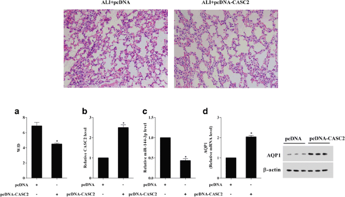实验目的是验证CASC2过表达对小鼠ALI的改善作用,明确其体内功能。方法细节为小鼠尾静脉注射表达CASC2的慢病毒或对照慢病毒(MOI=5×10^7 TU/mL),30分钟后气管内滴注LPS构建ALI模型,6小时后处死小鼠,取肺组织检测肺湿干重比,采用实时荧光定量聚合酶链反应和蛋白质免疫印迹检测CASC2、miR-144-3p和AQP1的表达水平。结果解读显示,CASC2过表达组小鼠的肺湿干重比显著低于对照组(n=10,P<0.05),肺组织中CASC2表达显著升高,miR-144-3p表达显著降低,AQP1的mRNA和蛋白表达显著升高,证明CASC2过表达可减轻小鼠ALI的病理损伤。