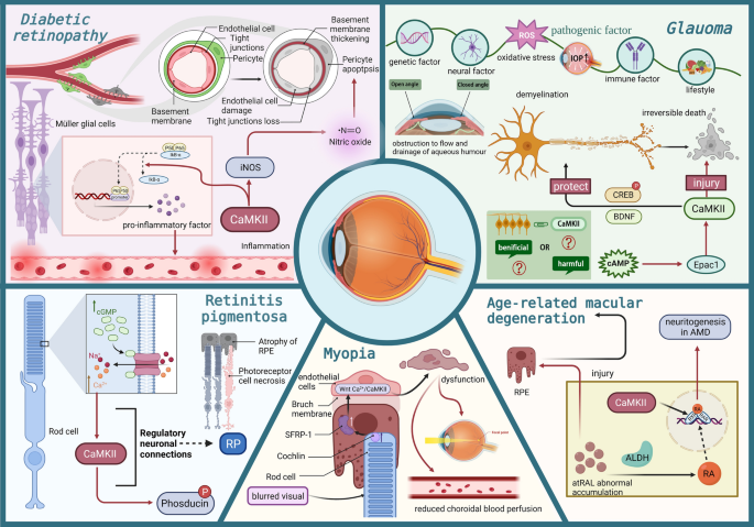 视网膜变性是一类以感光细胞进行性死亡、视网膜神经元不可逆损伤为核心特征的致盲性疾病,涵盖糖尿病视网膜病变、年龄相关性黄斑变性、视网膜色素变性、青光眼视神经病变等多种亚型,是全球成人失明的主要病因之一。领域共识:当前临床治疗手段以激光光凝、玻璃体切割等侵入性手术为主,缺乏安全有效的靶向分子疗法,且视网膜神经元再生能力有限,疾病进展一旦进入晚期则难以逆转。Ca²⁺/钙调蛋白依赖的蛋白激酶II(CaMKII)作为细胞内关键的钙信号传感器,在阿尔茨海默病等神经退行性疾病中已被证实参与病理过程,但在视网膜变性中的具体作用机制、靶向治疗的可行性仍存在大量研究空白。这篇综述系统整合了近年来CaMKII在视网膜变性中的分子机制、调控通路及治疗策略研究进展,旨在为该领域的基础研究与临床转化提供全面的参考框架。