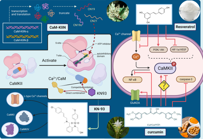 结果解读:KN-93作为经典的小分子CaMKII抑制剂,通过竞争Ca²⁺/钙调蛋白的结合位点抑制CaMKII活性,但存在特异性差的问题,可同时抑制其他激酶与离子通道;CaM-KIIN是天然的特异性CaMKII抑制剂,通过结合CaMKII的T-site阻断底物与催化域的结合,具有高特异性,但生物利用度低,难以穿透血视网膜屏障;白藜芦醇、姜黄素等植物来源抑制剂通过抑制CaMKII活性发挥神经保护作用,具有安全性高的优势,但作用靶点广泛,特异性不足。目前所有靶向CaMKII的治疗策略均处于临床前研究阶段,缺乏临床研究数据支撑。