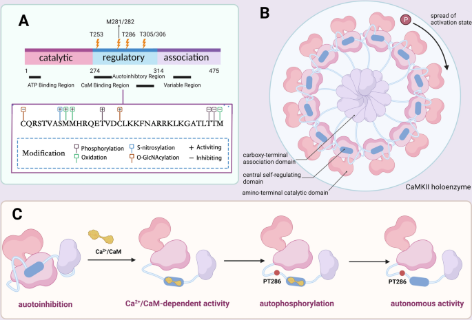 方法细节:通过整合结构生物学、分子生物学领域的现有研究数据,系统分析CaMKII四个亚型(α、β、γ、δ)的结构域组成,包括氨基端催化域、中央自调控域、羧基端关联域及可变剪接区域,同时梳理翻译后修饰(磷酸化、氧化、O-糖基化、S-亚硝基化)对其活性的调控机制。