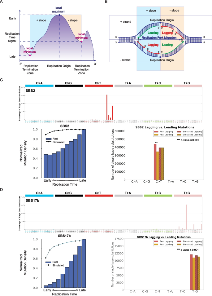 实验目的是解析突变特征与DNA复制过程的关联,明确其在复制时序区域及复制链上的分布偏好。方法细节:基于复制测序(Repli-seq)数据定义早/晚复制区域,将复制时序信号分为10个分位数,计算突变特征在每个分位数的归一化突变密度;通过小波变换识别复制起始/终止区域,定义前导链与滞后链,统计突变特征在两条链上的分布差异,采用Fisher精确检验进行显著性分析。结果解读:单碱基替换特征SBS2和SBS17b突变的归一化突变密度从早复制到晚复制区域逐渐增加(q值≤0.05),与晚复制区域损伤修复效率较低的领域共识一致;SBS2突变在滞后链显著富集(q值≤0.05),符合APOBEC脱氨酶靶向复制过程中滞后链单链DNA的特性,而SBS17b未表现出显著的复制链不对称性。产品关联:文献未提及具体实验试剂,领域常规使用Repli-seq试剂盒进行复制时序检测。